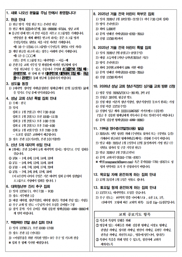 소식지_20251221 성남교회 0 26 2시간전 2025.12.19 15:49 소식지251221.hwp (208.0K) + 2 2025.12.19 15:49 소식지251221.pdf (246.9K) + 1 소식지_20251221